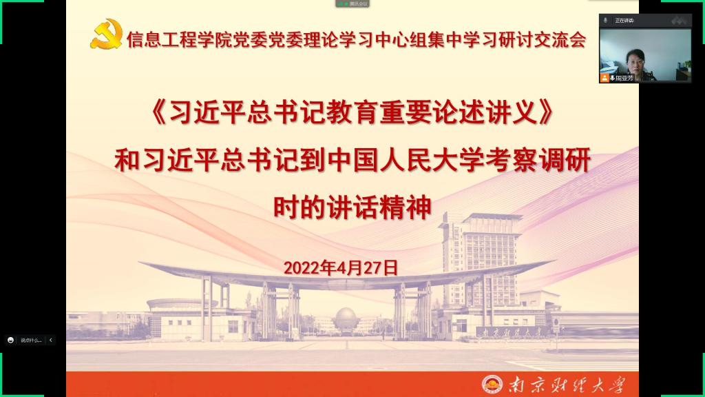 线上召开党委中心组集中学习研讨会,集中学习《习近平总书记教育重要论述讲义》中的部分章节和习近平总书记到中国人民大学考察调研时的讲话精神。全体院领导、党委委员参加集中学习研讨。院党委周亚芳书记主持了会议。