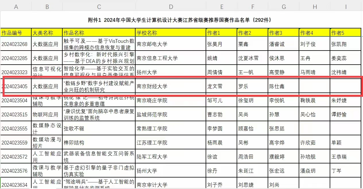 学生项目《“数链乡野”数字乡村建设赋能产业兴旺的机制研究》(参赛队员:龙文雪、罗乐、陈仕鑫;指导教师:蒋伟伟、杨佳宁)经过激励角逐,获得特等奖并晋级国赛,蒋伟伟老师、杨佳宁老师获评优秀教师指导奖。