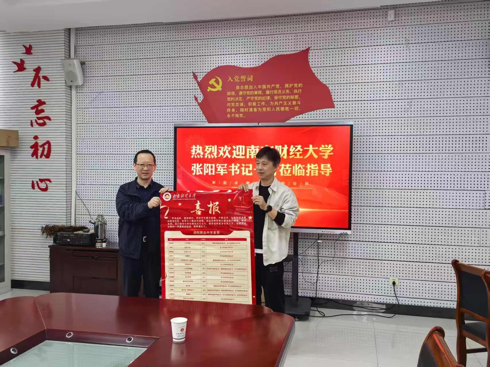 张阳军书记一行先后走访了江苏省宿迁中学、江苏省沭阳高级中学、江苏省沭阳如东高级中学、江苏省泗阳致远中学,分别与四所中学校领导、年级主任、班主任代表交流座谈,并代表学校向四所中学赠送优秀学生奖学金喜报。