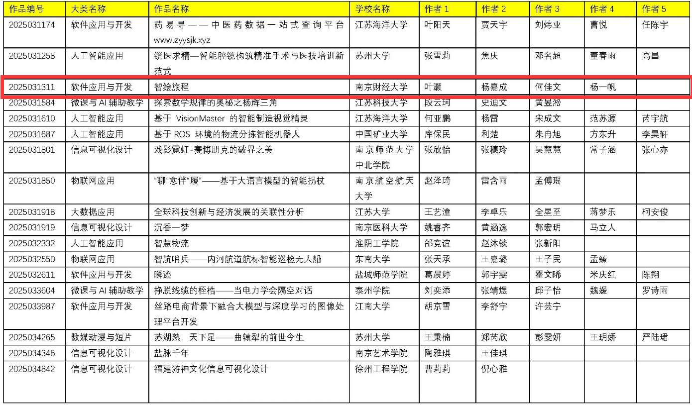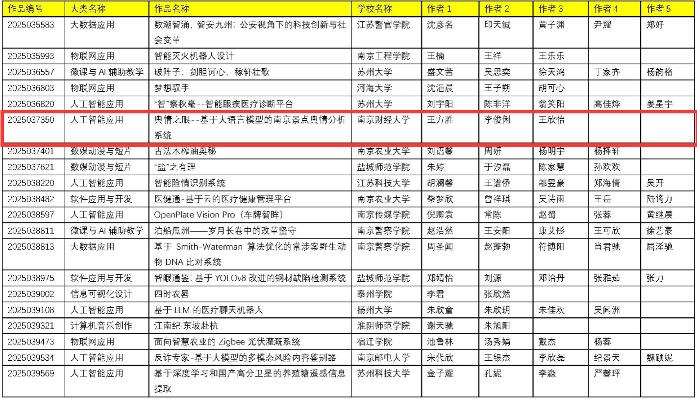 袁超、徐鑫源、朱念生、杨光、王莉春同学的《FusionAR:室内复杂场景下的视觉﹣地标协同导航系统》(指导老师:朱利涛)项目斩获二等奖,晋级国赛;王方胜、李俊俐、王欣怡同学的《舆情之眼——基于大语言模型的南京景点舆情分析系统》(指导老师:朱桂祥)、代英瑾、张黄倩、杨迪越、胡晏子同学设计的《AI就业市场全景洞察:大数据视角下的人才供需分析与战略应对》(指导老师:蒋伟伟)、 叶灏、杨嘉成、何佳文、杨一帆同学创作的《智绘旅程》(指导老师:李树青)获得三等奖。这些作品选题新颖,紧密结合人工智能、大数据等前沿技术,展现了解决实际问题的创新思路,充分体现了红桃视频