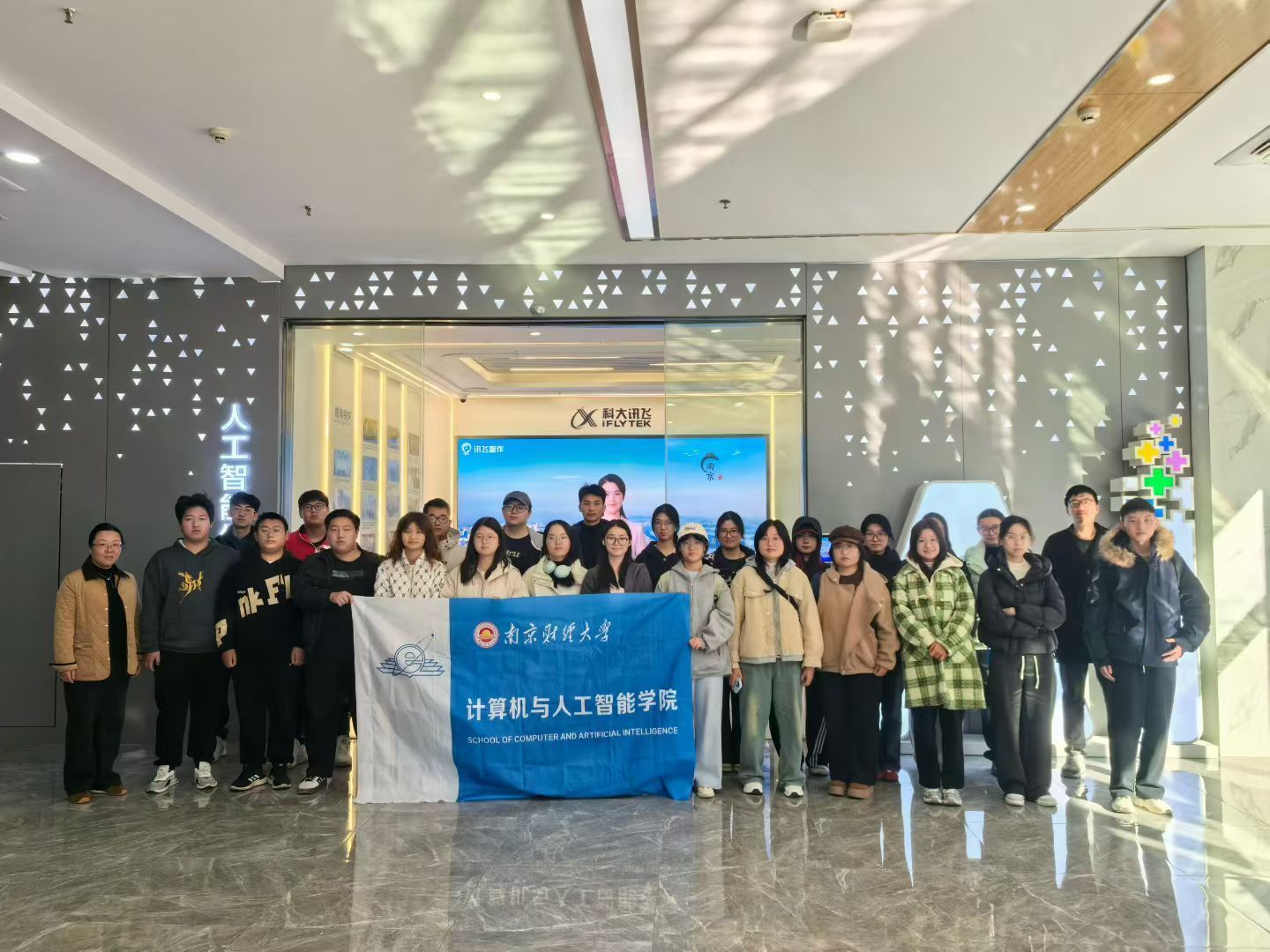 计算机(科大讯飞)2501班全体学子分成两批,前往位于南京徐庄软件园二期的科大讯飞公司江苏区域总部进行实地参观研学,该班学生辅导员张媛媛、企业驻校代表张荣豪陪同前往参观。