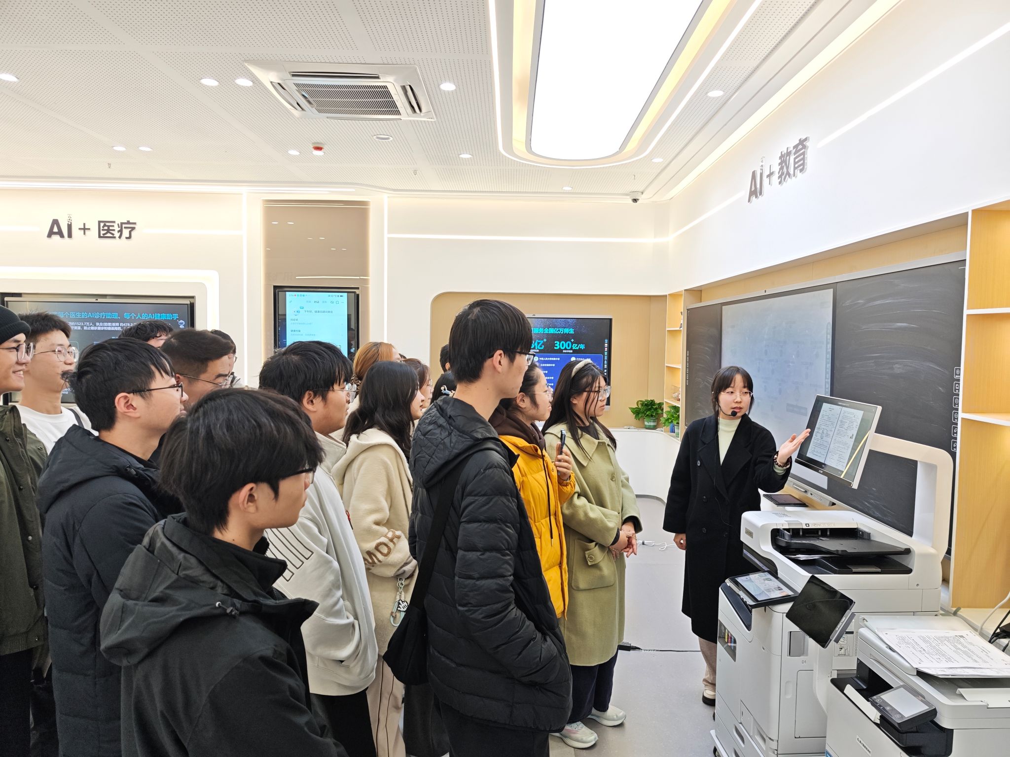 此次参观实践通过星火大模型在教育、医疗、工业三大场景的落地案例,帮助学生在语音识别精度优化、多模态交互算法设计等具体技术维度深化理解。在人工智能展厅核心区,技术团队通过动态交互系统呈现了多语种智能语音识别、星火大模型多模态交互、智慧车载音频系统等创新成果。以星火大模型为例,其七大核心能力在教育、医疗、工业等场景均有具体应用,同学们通过现场操作智能办公本,体验手写纪要与AI纪要融合功能,直观感受到人机协同技术如何重构办公场景。学生代表柳佳怡表示,这次参观让专业理论真正"活"了起来,帮助同学们明确后续在算法优化、跨模态交互等方向的深入学习与研究。