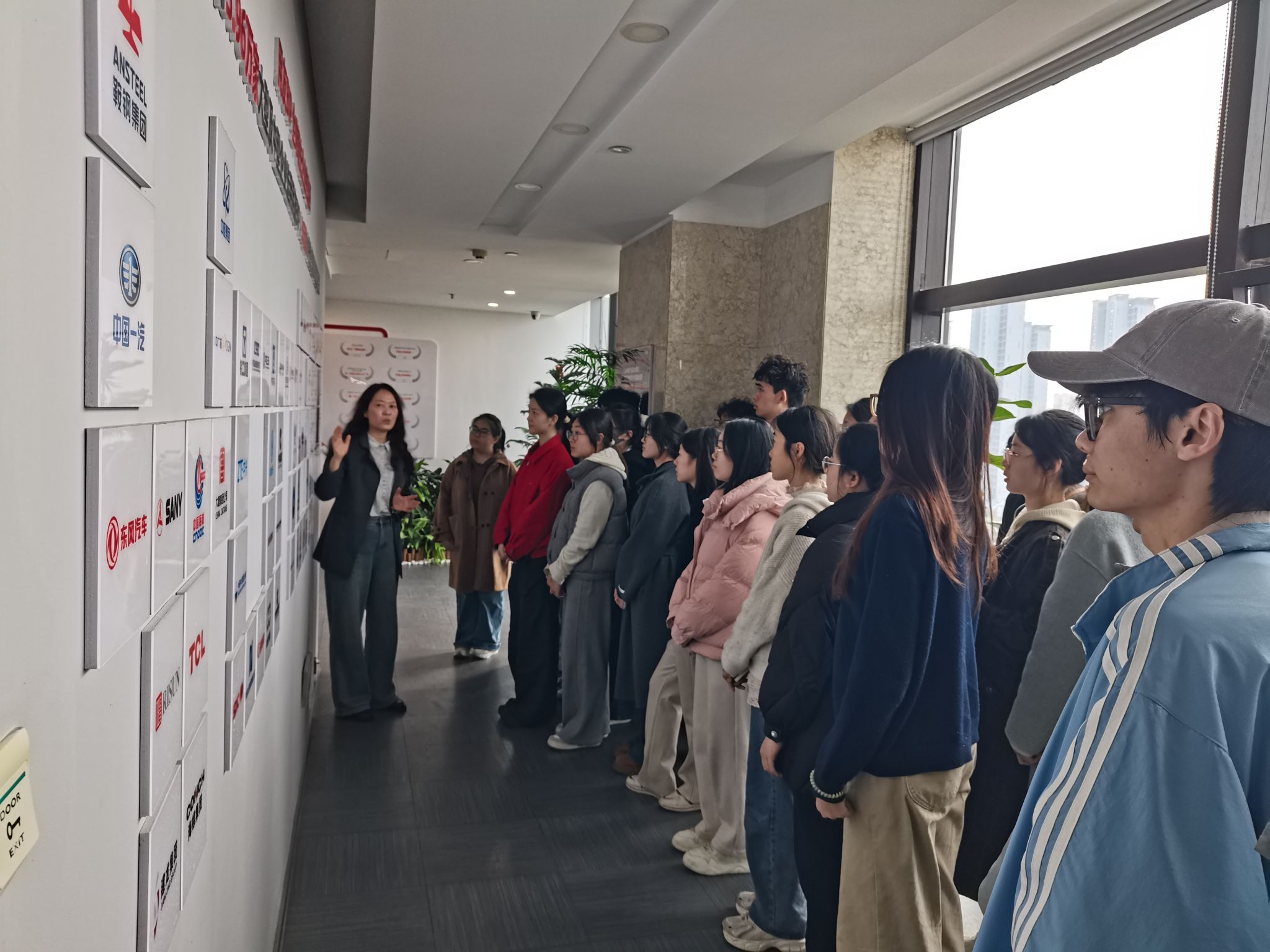 在用友网络科技股份有限公司江苏分公司人力资源部区域总监蔡菊屏的陪同下,师生一行先后参观了企业数字体验馆与办公区域,全方位了解用友自 1988 年成立以来的发展历程、核心业务布局,以及企业在云服务、软件研发、数字化平台建设等领域的创新成果。作为国内领先的企业管理软件与服务提供商,用友深耕企业数字化转型领域多年,不仅在技术研发上持续创新,更在人才培养、体系建设方面投入大量资源,为行业培育了大批专业人才。