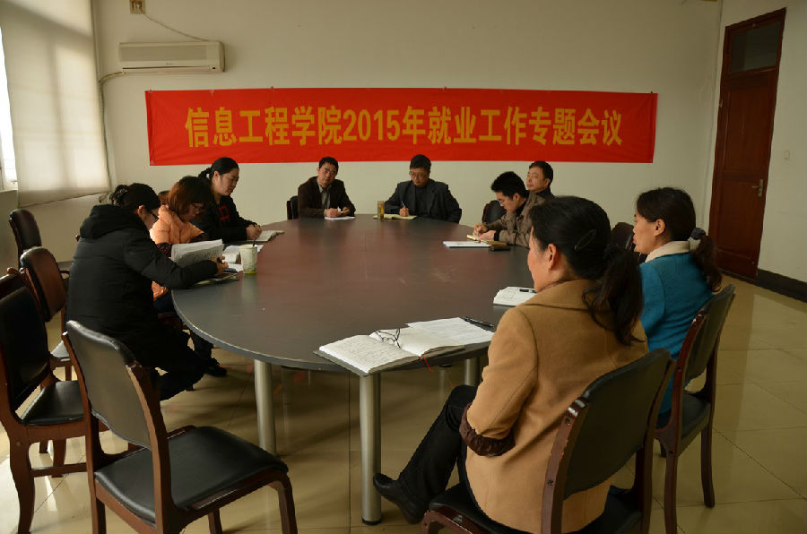 在理工学科楼428召开了2015年就业工作专题会议。本次会议由党委副书记潘雪峰主持,参加会议的有党委书记韩忠愿,院长曹杰,副院长许建平、宣恒农、科研秘书田世红及全体学工队伍老师。