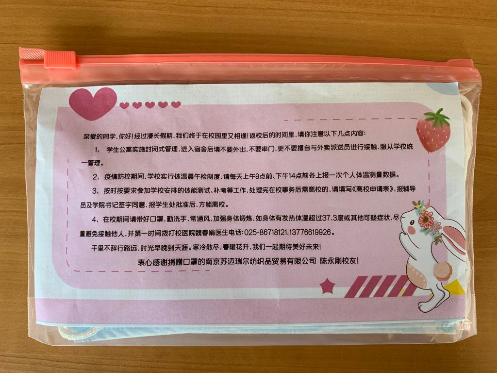 4月21日下午,红桃视频 辅导员孙脉、倪青青两位通过“腾讯视频会议”为即将返校的43名16级学生举行“法纪•诚信•责任”疫情防控专题教育会议,聚焦法纪、诚信和责任三个关键词,围绕疫情防控基本常识、返校过程中的个人防护、返校报到的注意事项、返校后的学习生活安排等内容进行了讲解。4月22日,返校报到现场,学院为返校学子送上装有李永刚校友捐赠口罩的小礼包,小礼包上并附有返校后学生管理注意事项的温馨提示。
