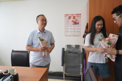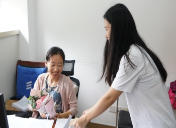 感恩小队首先抵达党委书记办公室,周亚芳书记收下学生们的节日祝福后,对感恩小队表示感谢,然后对学生会学生的工作给予肯定,并给出今后工作的建议与意见。