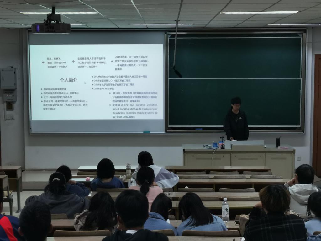 在博远楼JA106教室召开大学生涯规划分享会。本次交流会邀请到2021年考研取得优秀成果的计算机1703班学生陈骁飞,为刚步入大学生活的学弟学妹们讲述自身经历,交流切身体会,分享宝贵经验。