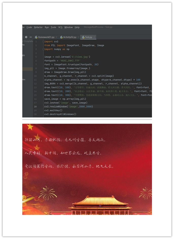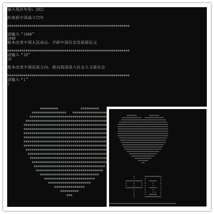 趣味代码表实意——“编程祝国庆”。学生们利用自己已学到的专业课知识,用自己的方式为祖国母亲献上祝福。一行行代码,体现出工科学生特有的浪漫主义情怀,树立起与常人认知不同的程序员形象。国家繁荣富强,我辈且能无为,信工学子纯熟的学习能力与技术应用能力,凸显内心对于祖国深切的爱意,更加注入了人文化、艺术化的青春活力气息。