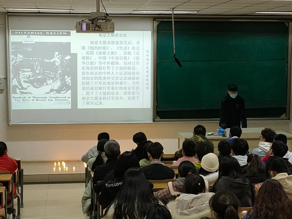 活动伊始,由徐苏阳同学向大家讲述史实,并观看有关南京大屠杀的视频资料,视频揭露了日军残忍罪行的真实片段,让同学们了解到了战争的残酷以及当今幸福生活的来之不易。然后,通过播放侵华日军南京大屠杀遇难同胞纪念馆视频,同学们可以更全面了解南京大屠杀的历史,看到了遇难者留下的遗物,看到了30万被害人的名字被刻在一座墙上,看到了那场屠杀中真实的场景……
