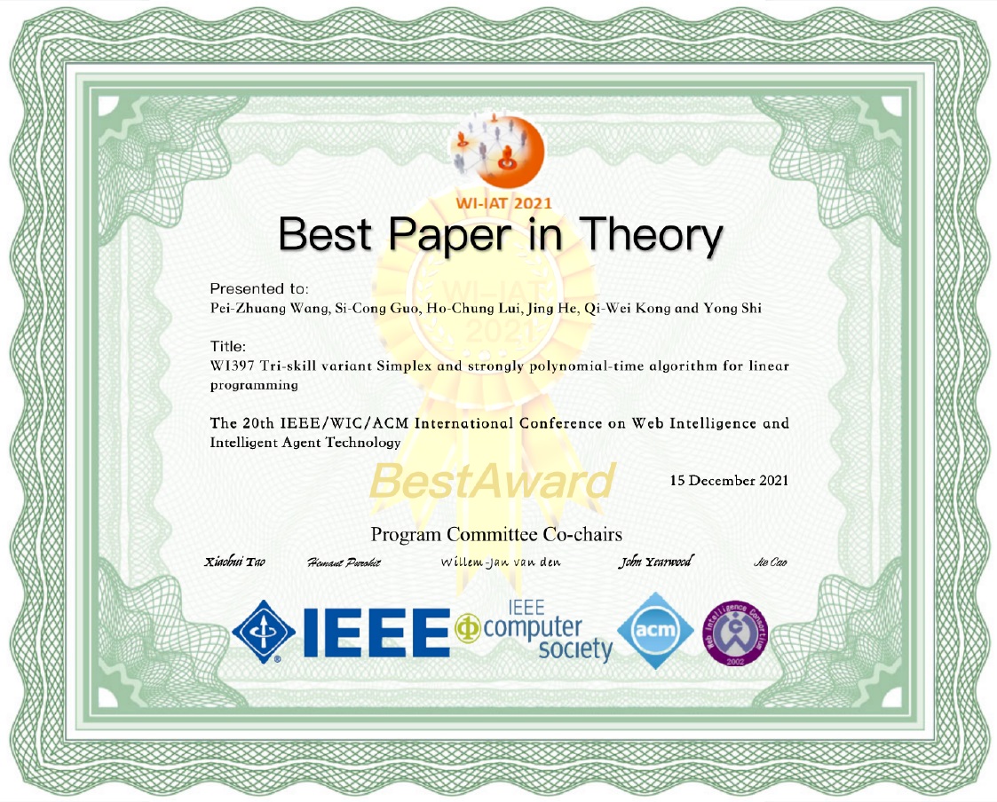 院长曹杰教授与何静教授的联合指导下完成,论文题目为:Tri-skill variant Simplex and strongly polynomial-time algorithm for linear programming(单纯型法的三种变体技巧及线性规划的强多项式时间算法)。线性规划是否存在强多项式时间算法一直是一个跨世纪的国际数学问题,其位列著名的Smale世纪难题之列,对该问题的突破将是一个重大的理论性创新,也将为人工智能发展所面临的逻辑推理危机带来一定的理论性支撑。为了突破此难题,该论文基于前人的研究基础,提出了三种不同算法变体,该文提出的方法有望帮助线性规划研究者建立强多项式时间算法。此外,论文还提出了三种算法结合的优化方法,该方法可能将为线性规划问题的计算提供更简单的解决思路。该论文预印本已在arXiv.org数据库公开发表。