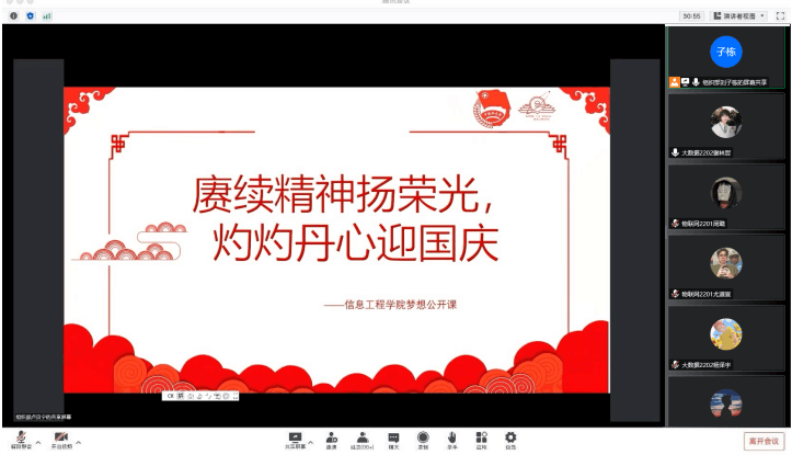 为大力弘扬爱国主义精神,增强同学们的爱国意识、激发爱国热情,培养责任感和使命感,9月29日晚,信息工程学院在线举办了“赓续精神扬荣光,灼灼丹心迎国庆”梦想公开课,2022级全体同学参加。