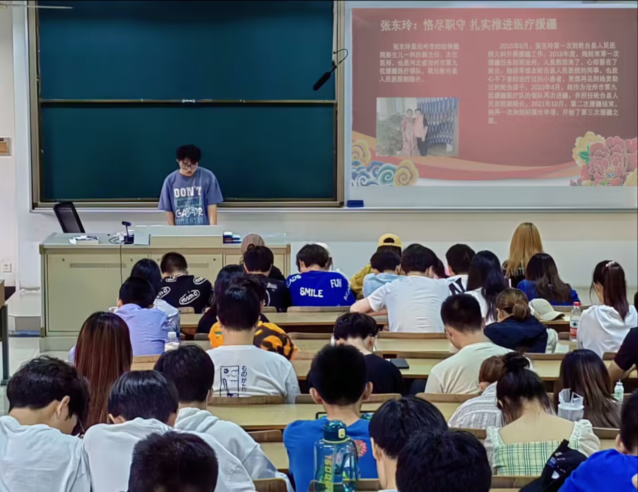 活动开始,同学们观看视频《以团结之名》,并在主持人介绍中了解我国民族政策,明确民族团结的重要性。模范们投身于民族团结事业,令人敬佩——医疗队领队张东玲恪尽职守,扎实推进医疗援疆,为轮台县人民提供优质服务;新疆青年玉苏普江·艾比布拉急公好义,在湖北长江沙滩救下三名落水者;康平县民族团结进步模范韩秋英创办爱心墙志愿者服务队伍,形成党员一对一、多对一帮扶体系。
