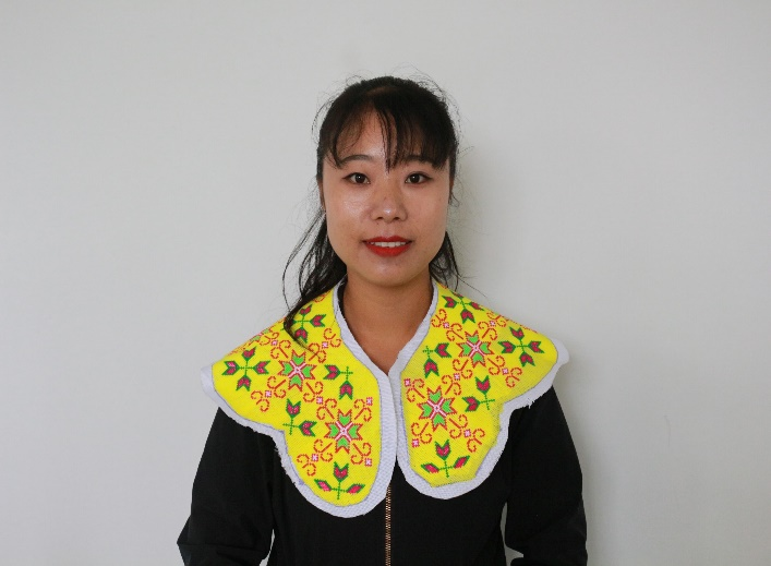 首先,在上山村村委会,绣娘马学珍拿出自绣的苗绣布料摆在桌上供实践队员观察。过程中队员们了解到,这布料是苗服的组成部分——在面料上绣上想要的花纹,将绣好的部分缝制起来,最后制成成衣。交流中,有队员问道“苗族服饰都需要制作哪些部件”,马女士拿出手机,摆出苗服成衣的图片,解释布料与成衣部位的对应。“这个是裙子的花纹,这个是裙腰的花纹,这个是披肩的花纹……”马女士拿着披肩的部分披在肩上给队员们展示。裁剪得当的尺寸,独具创意的花纹让队员们眼前一亮。