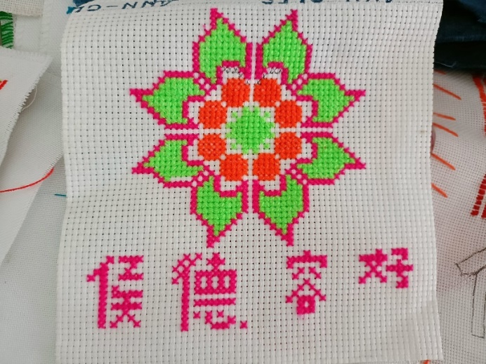 “这个姐姐的眼里透着温柔和坚韧”,队员们这样评论马女士。马女士给队员们展示她亲手绣的第一套苗服的照片,又给队员们讲解那独特样式的花纹。“我们所绣的图案都是没有标准参考的,全凭自己想象来创作。这个图案是我绣出来的,别人拿着照片参考,到现在也没绣出来。”她如数家珍地道出她绣过的图案。队员们所见的每一个苗绣图案都独一无二,是绣娘别出心裁地设计后一针一线绣出的独具魅力的苗族特色刺绣。