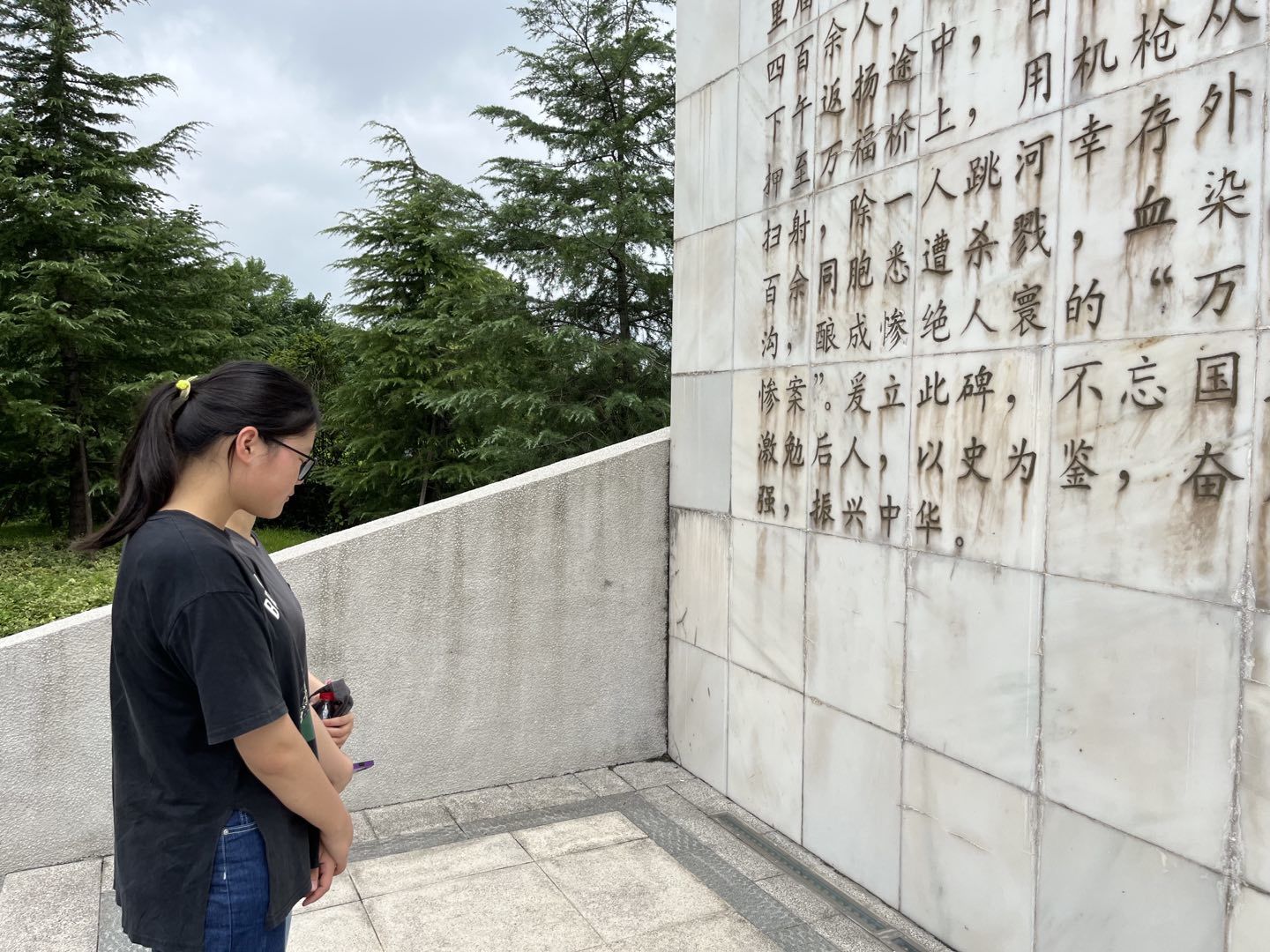 来到扬州万福桥,这里记录着“历史的一页”——侵华日军万福桥大屠杀遇难同胞纪念碑,碑厚重凝炼,时刻警戒后人“历史之痛,不能忘却”,也激励后人以史为鉴,奋发向上,以己身筑强国。小队成员站在纪念碑面前,对逝去的同胞进行三分钟的默哀。