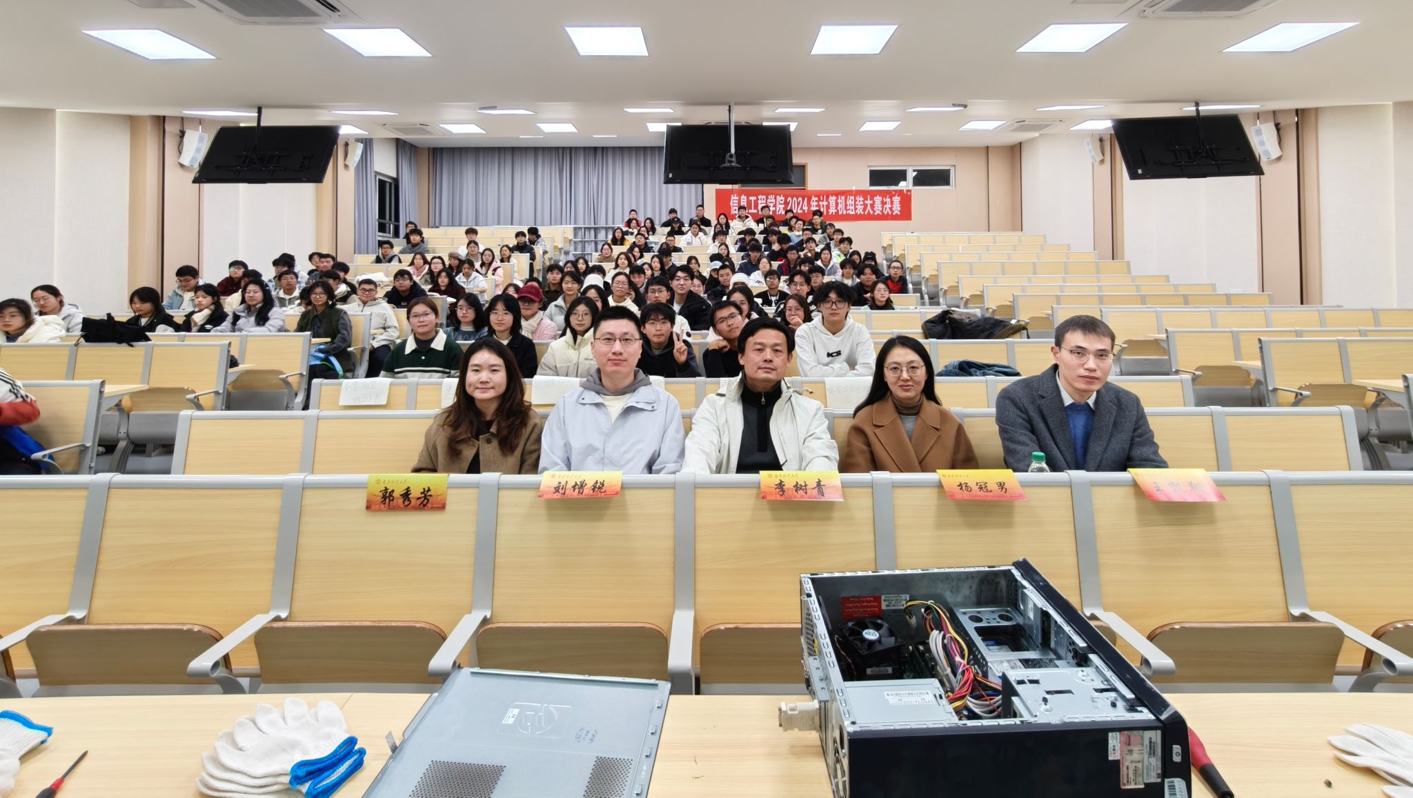在博观楼202教室举办了2024年计算机组装大赛决赛。此次比赛由李树青副院长、杨冠男老师、王凯翔老师、刘增锐老师担任评委。