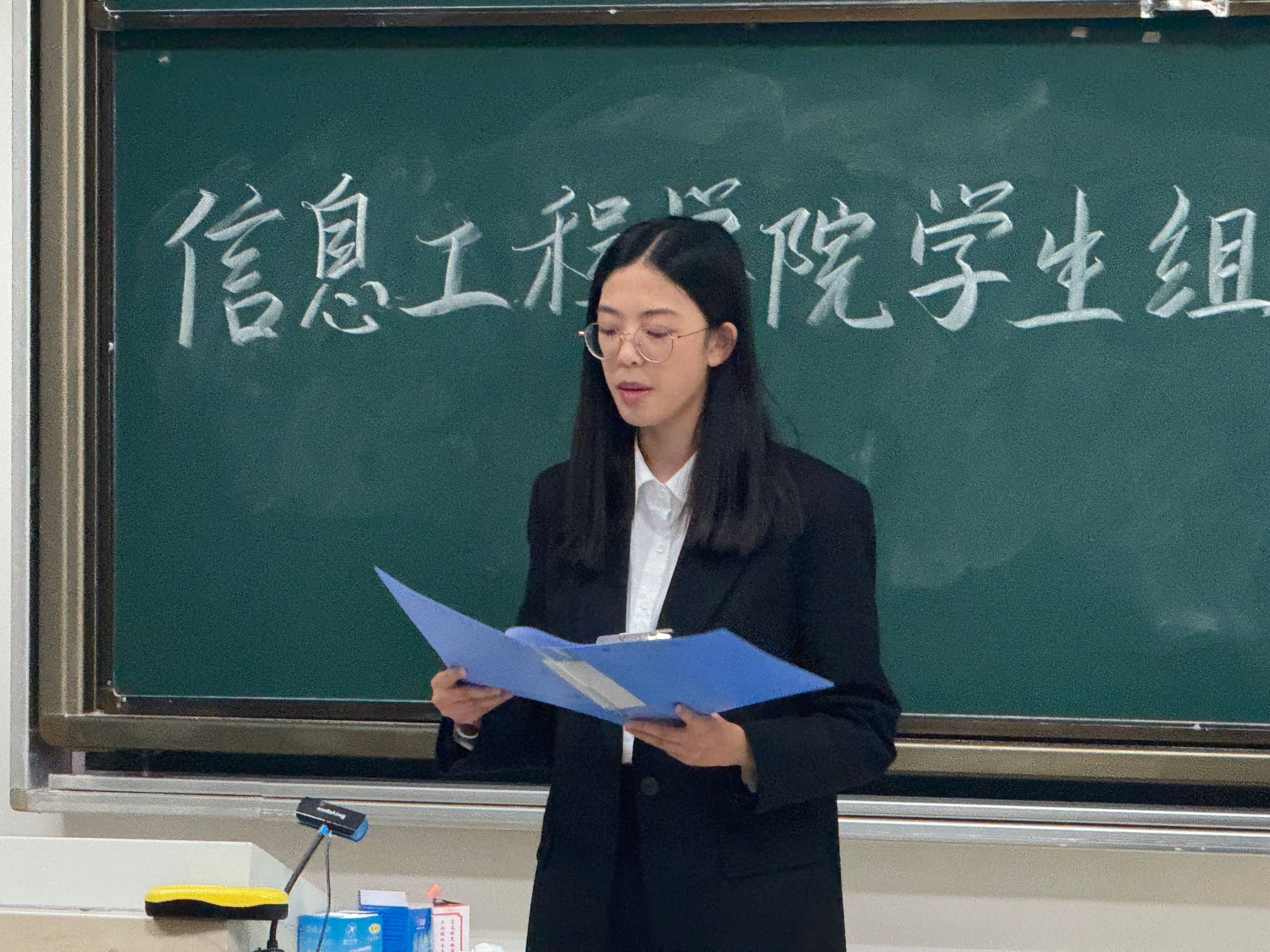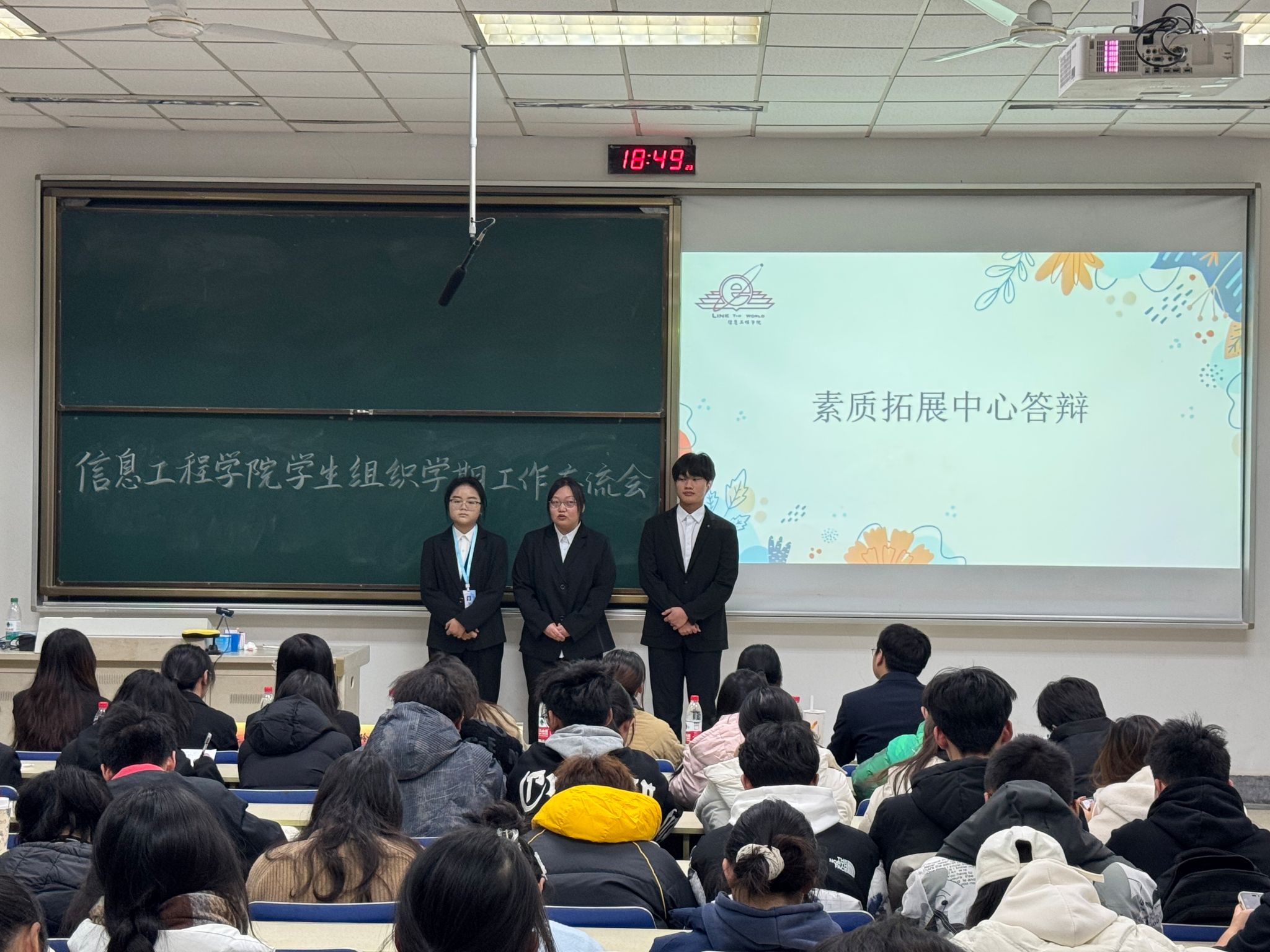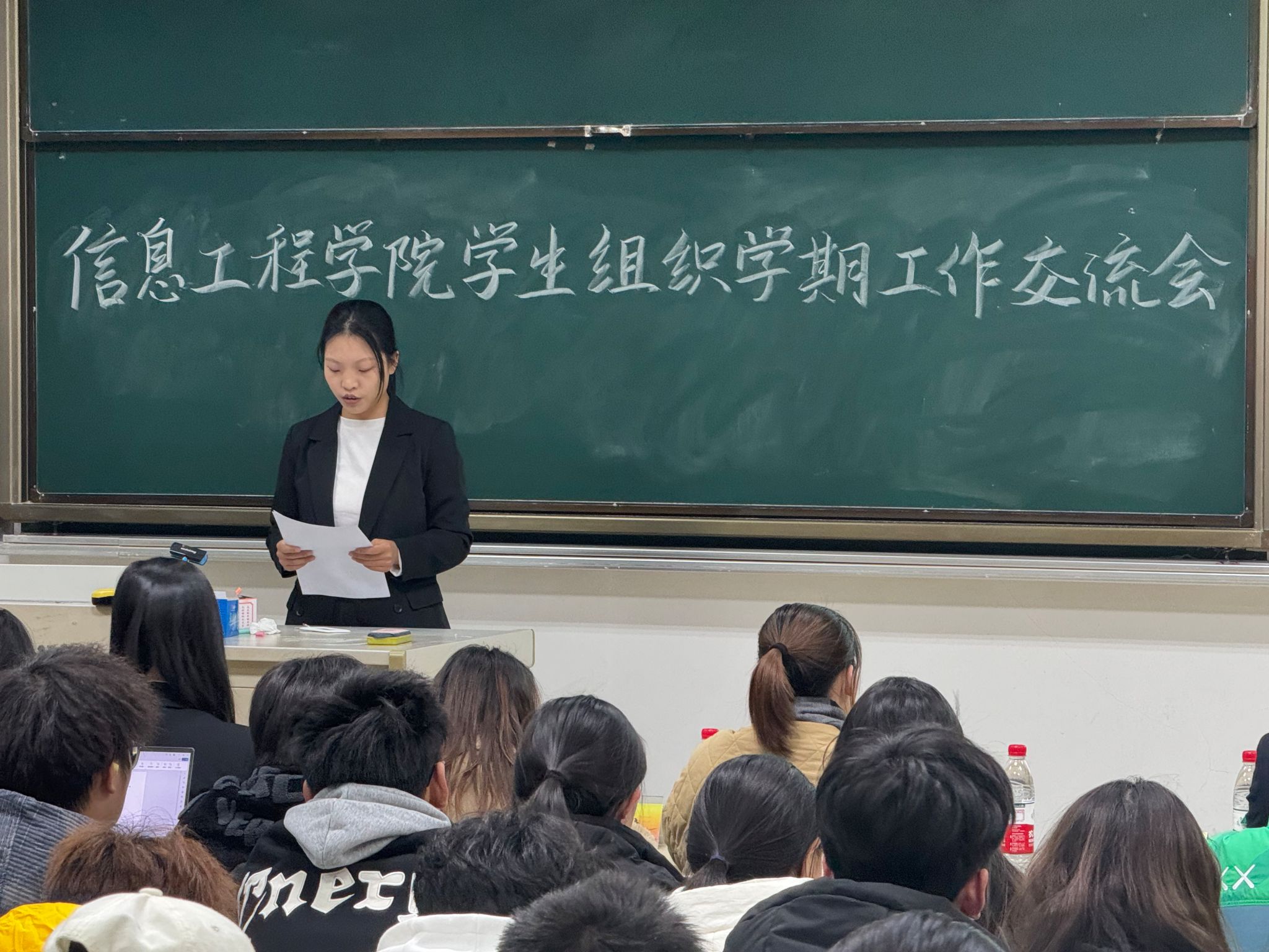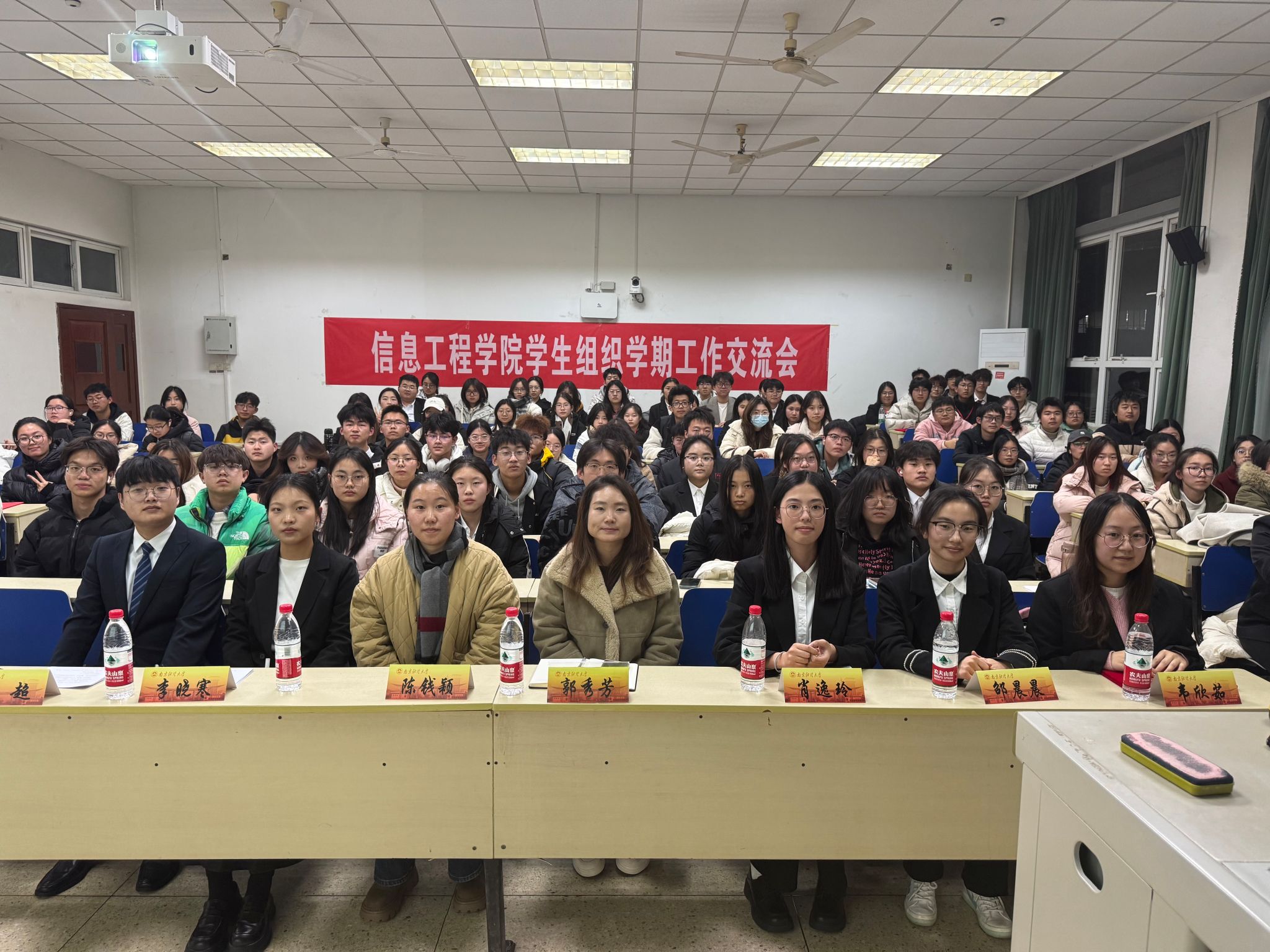 学生组织学期工作交流会于德业楼118教室举行。院团委书记郭秀芳老师、法学院学生会主席陈钱颖、信工院学生会主席肖逸玲、信工院学生会主席邵晨晨、信工院学生会主席韦欣茹、信工院团委副书记(学生)李晓寒、信工院团委副书记(学生)袁超、各班级代表及分团委、学生会全体成员参加会议。