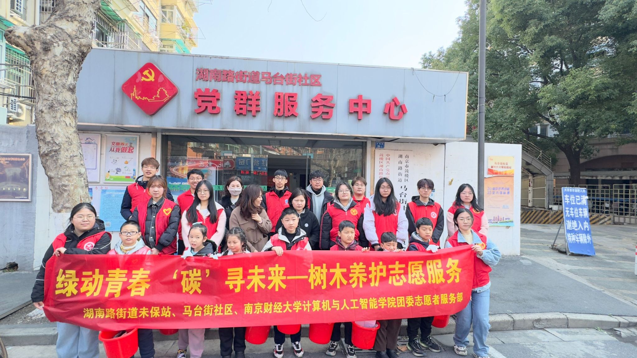 志愿者服务部与南京市鼓楼区湖南路街道马台街社区党群服务中心联合举办"绿动青春,碳寻未来"植树节主题公益活动。本次活动以家庭为单位组织,共吸引50余组亲子家庭参与,通过将树木养护实践与"3·15国际消费者权益日"、人工智能知识和反诈宣传相结合,为社区注入绿色发展活力与法治文明新风,获得社区居民广泛好评。