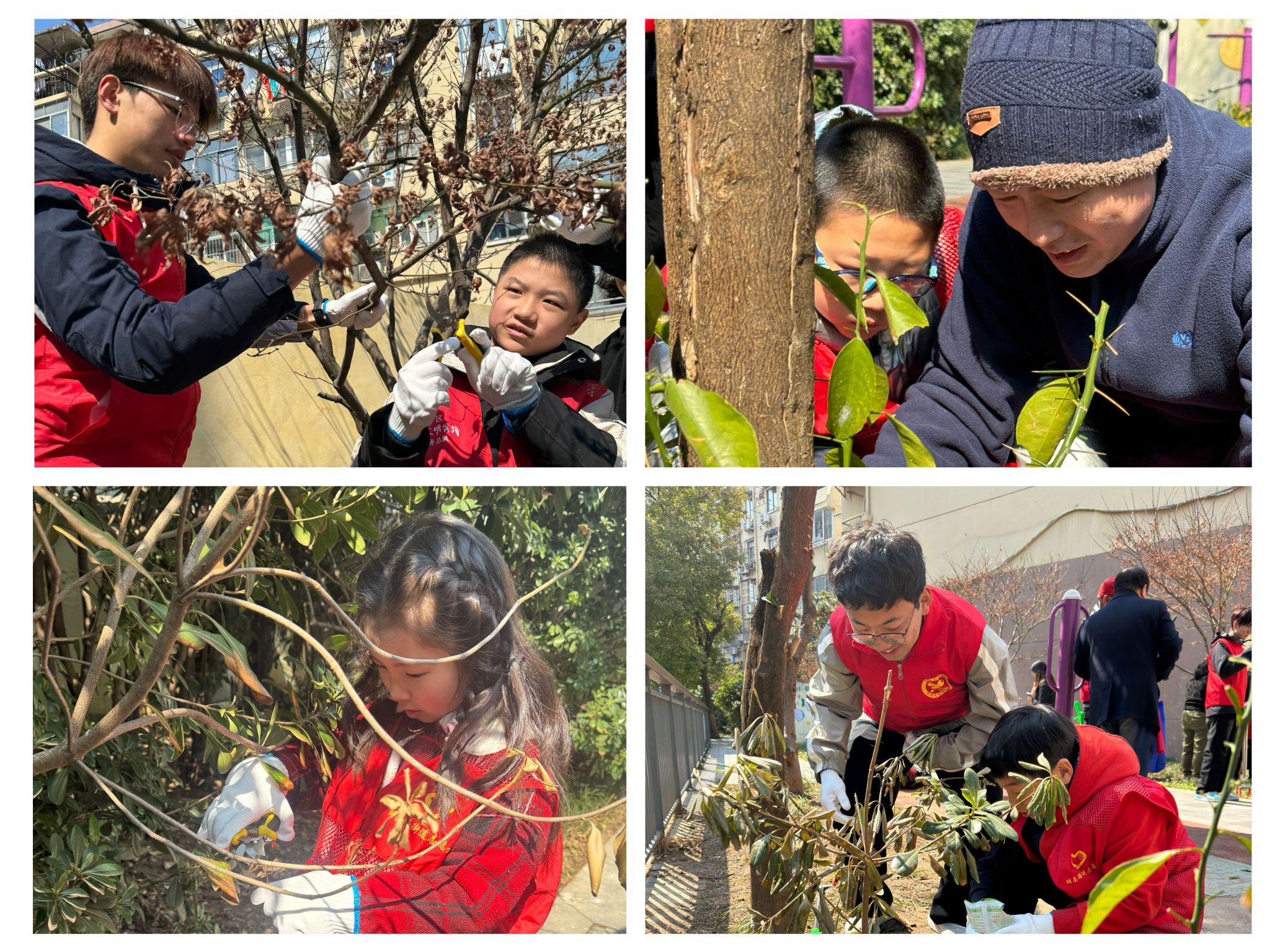 活动现场,志愿者统一着装,为参与家庭分发专业工具并提供技术指导。在志愿者指导下,家长与孩子们分工协作,开展树木松土施肥、枯枝修剪等养护工作。为确保活动专业性,志愿者团队预先通过专业平台系统学习树木养护知识,现场化身“小老师”,详细讲解"施肥距离控制""伤口处理"等技术要点。一位参与活动的父亲表示:“孩子第一次亲手照顾树木,不仅学到了环保知识,更感受到劳动的快乐,这样的实践教育比课堂更生动!”。