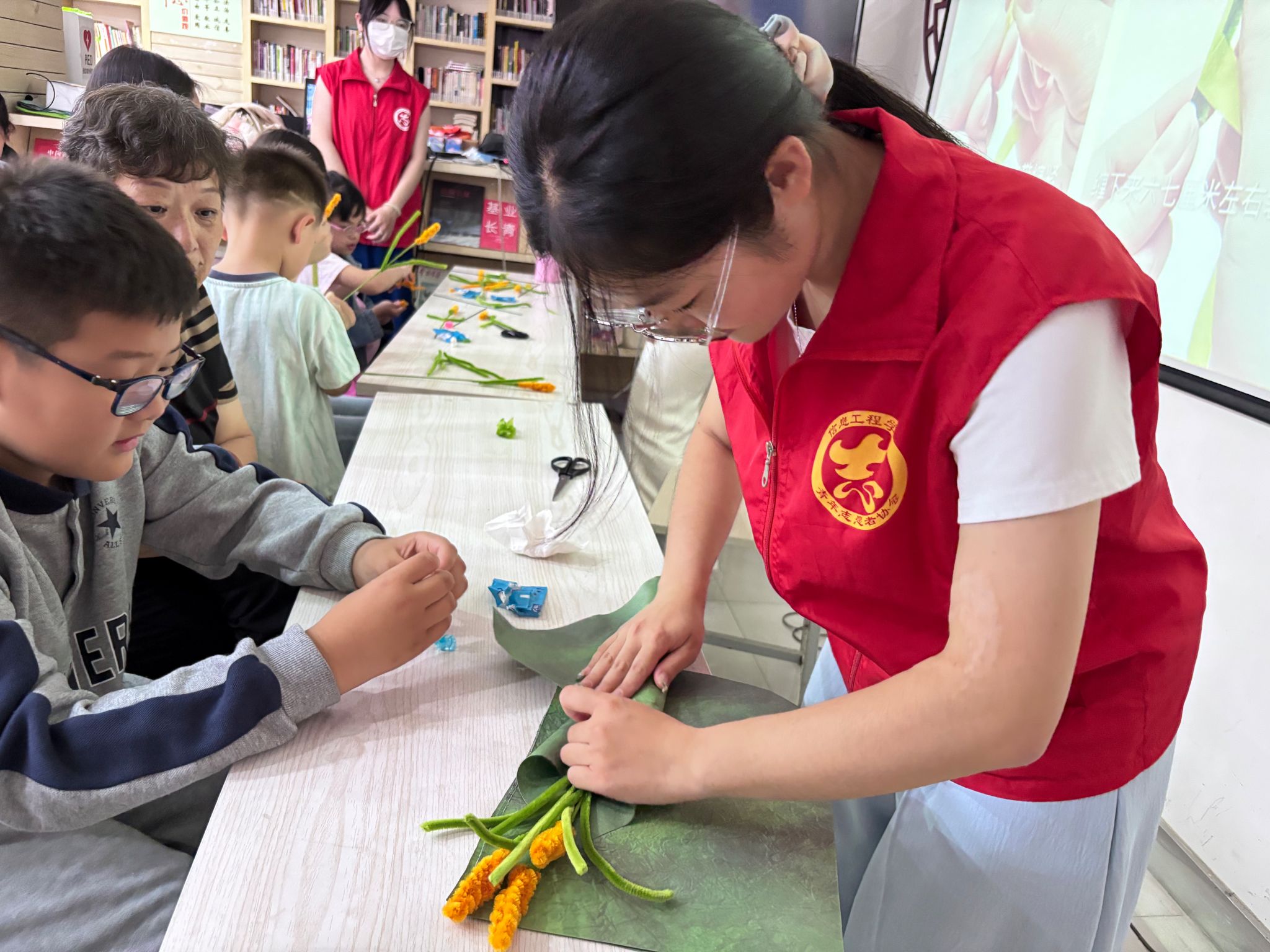 志愿者与小朋友们一起制作麦穗