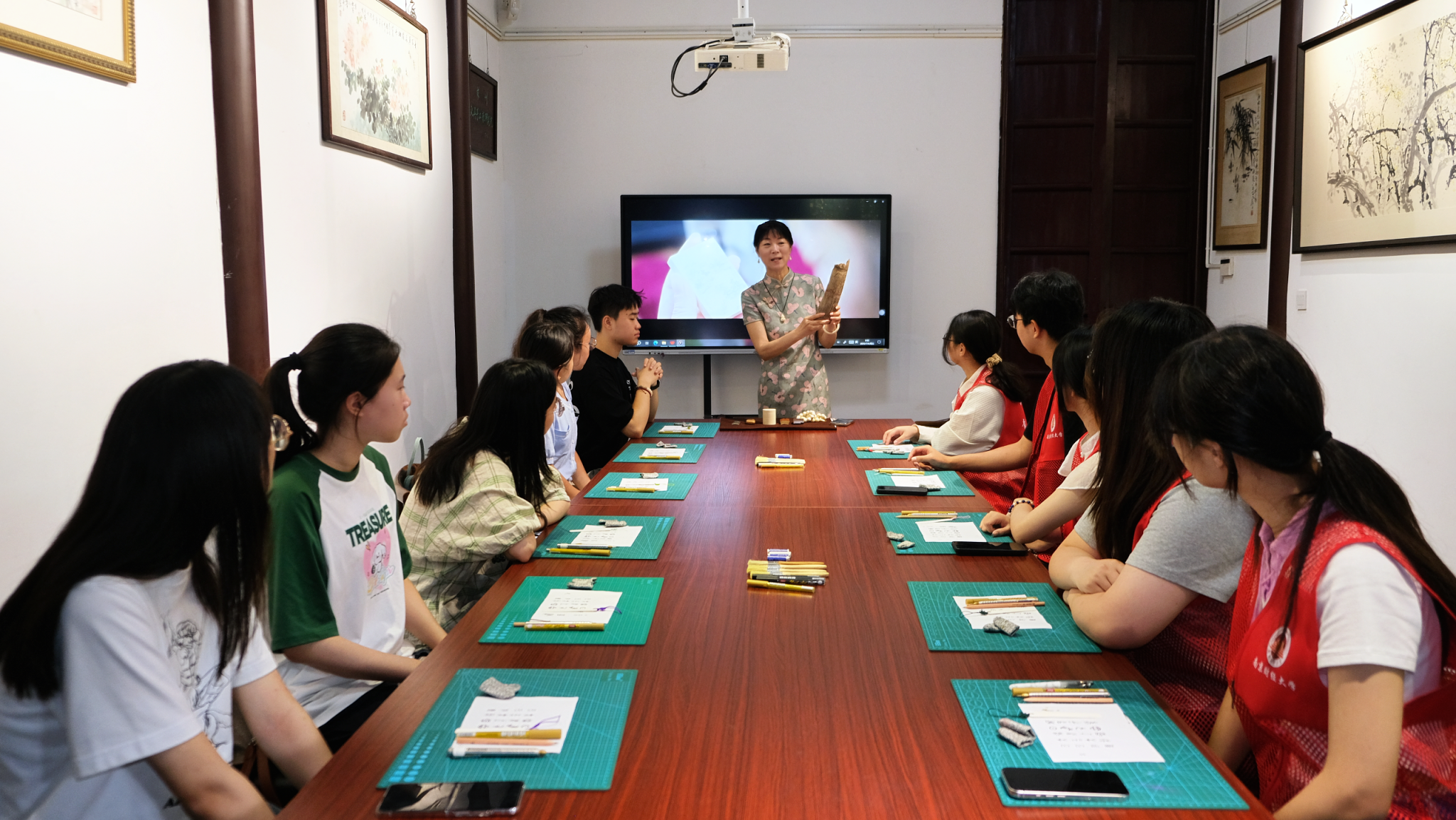 “吴地遗珍”展厅,从良渚文化的玉琮到春秋时期的青铜剑,从宋代的青瓷执壶到明清的苏式家具,成员们通过观察文物的材质、工艺与纹饰,梳理出吴地文化“崇文重艺”的特质。