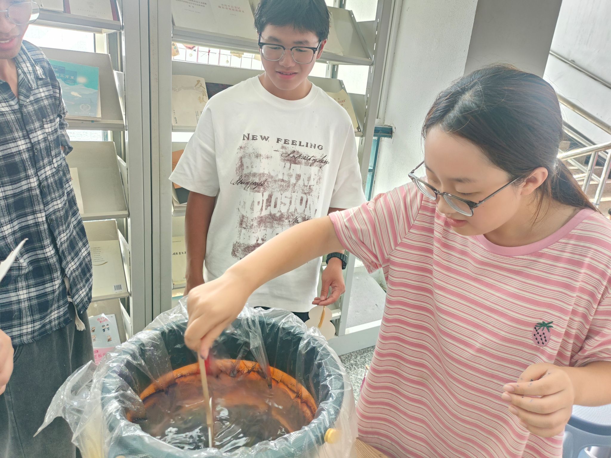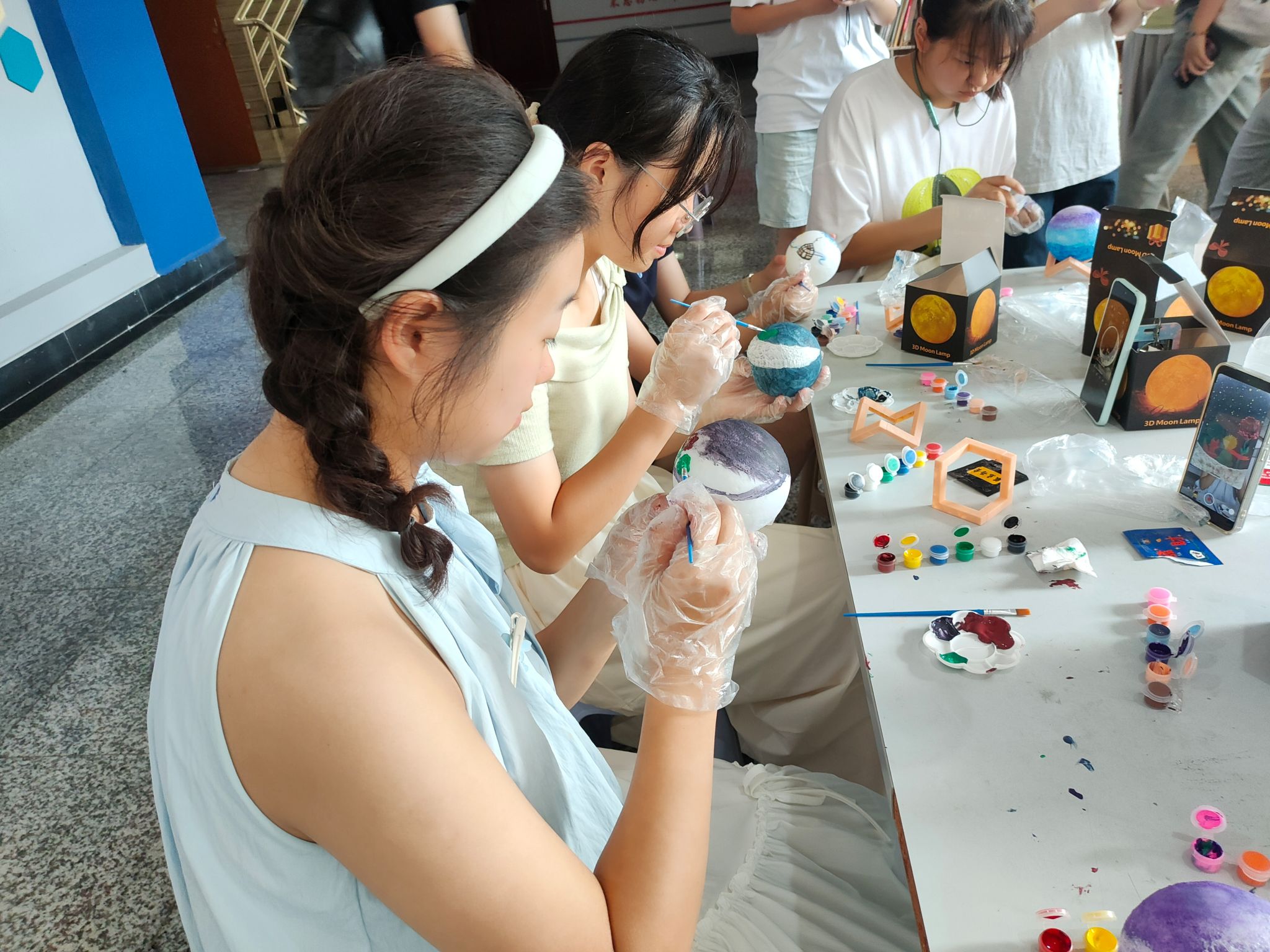 活动现场,来自不同民族的同学们悉心调配颜料,将色彩滴入水中,再以巧思引导扇面与液体交融——转瞬之间,一幅幅流动而独一无二的纹样便跃然扇上,中秋意蕴与非遗技艺完美融合。另一侧,大家俯身勾勒,笔尖点亮盏盏月球灯,绘出心中最美的团圆图景。尽管来自不同地域、不同班级,但在水色与光影交织的创意空间里,彼此的距离悄然拉近。每一把独具匠心的漆扇、每一盏温暖明亮的月球灯,都成为同窗情谊与团结共识的生动见证。