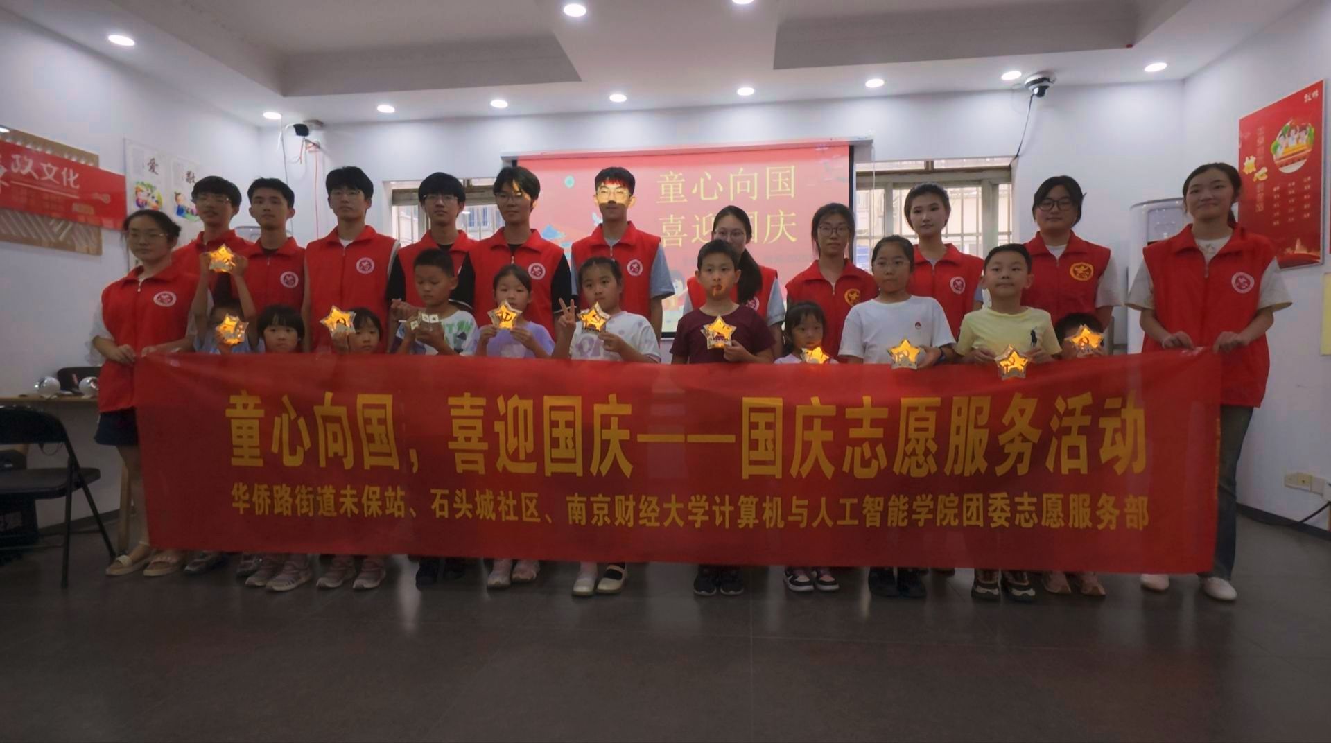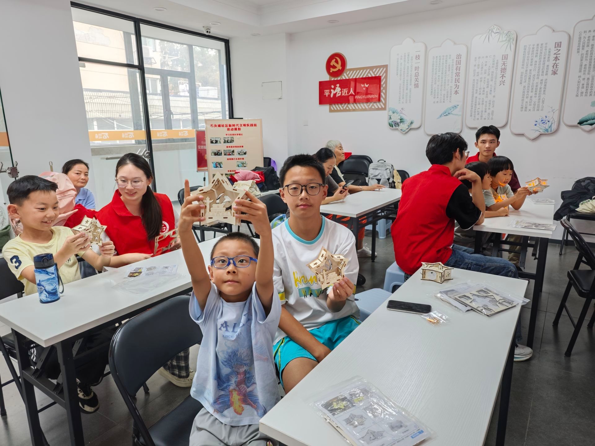 在制作手工作品的环节,彩纸、剪刀、胶水分发到手,志愿者细致讲解制作步骤及其背后的爱国寓意。孩子们在志愿者的协助下,亲手制作出一件件饱含心意的爱国星摆件。小手虽稚嫩,心意却真诚。作品完成后,孩子们高高举起自己的成果,一张张笑脸写满自豪,童真的祝福凝聚于指尖创作。