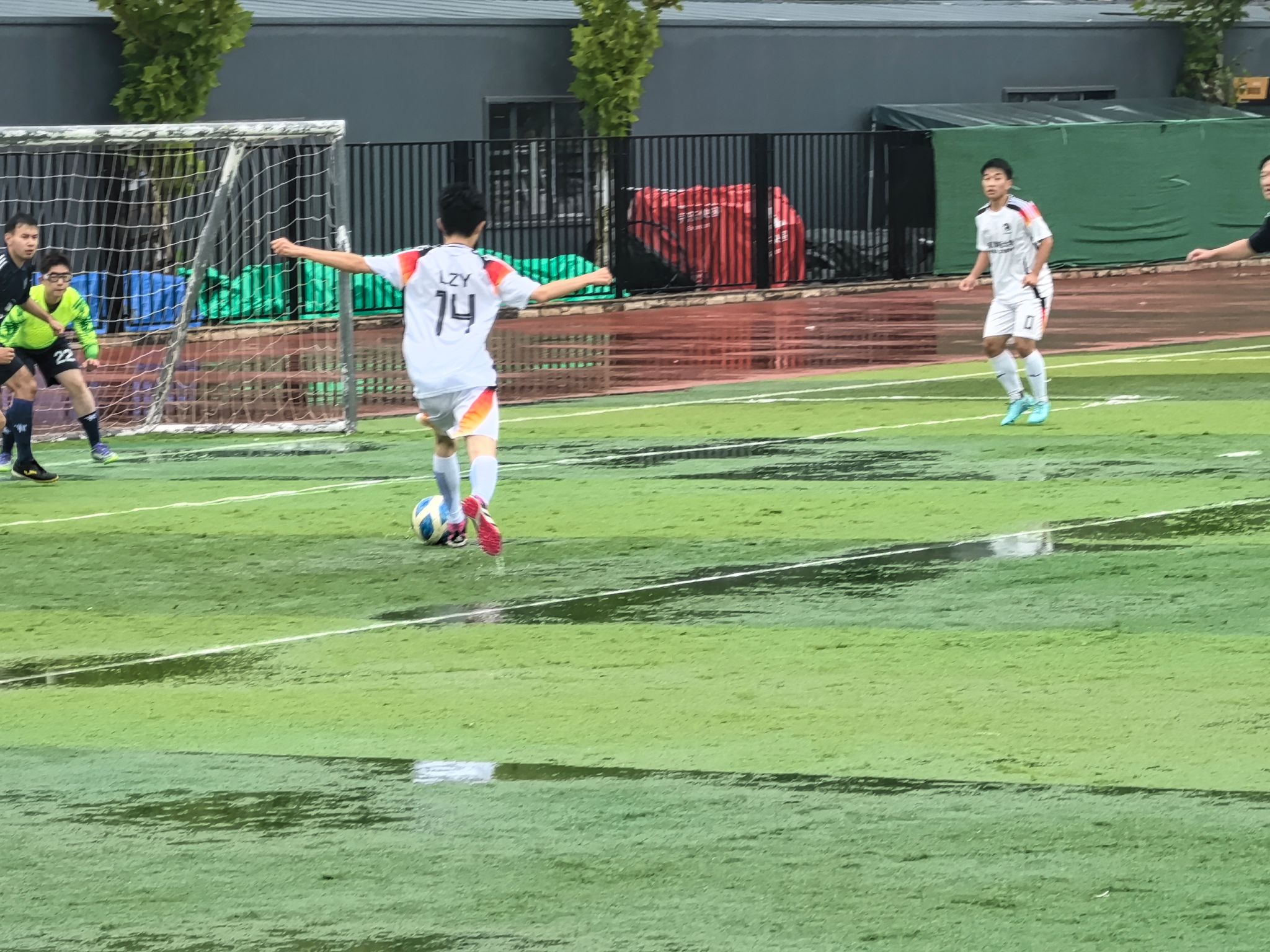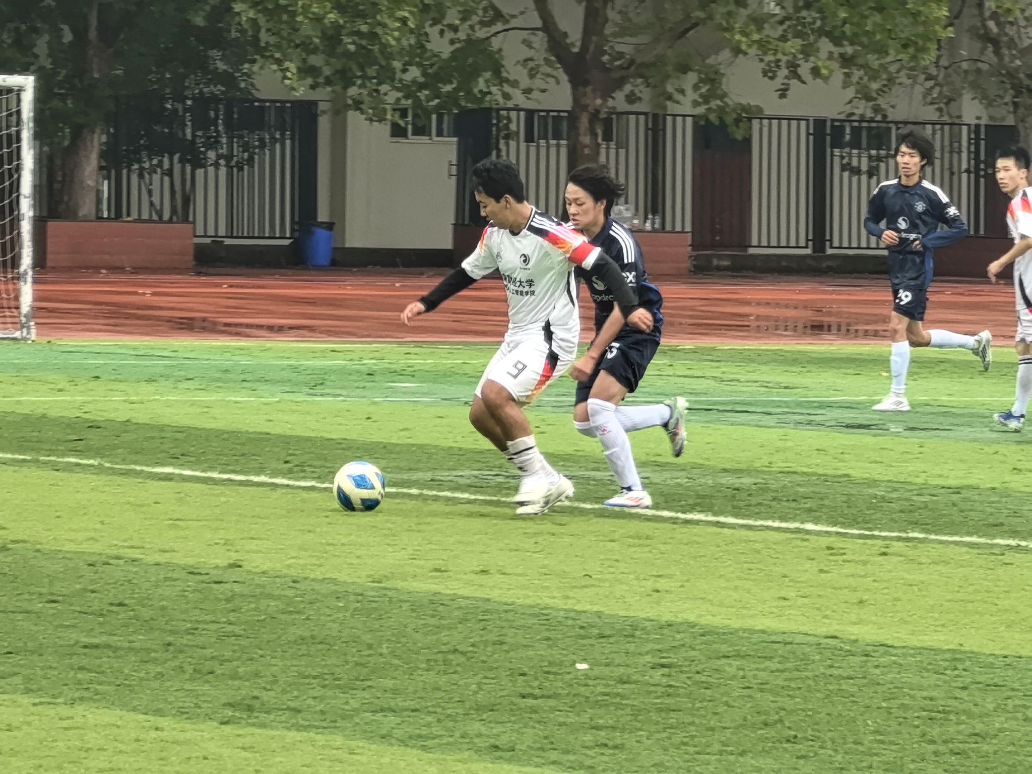 在湿滑的场地上,双方你来我往,互有攻守,比分交替上升,战况一度陷入胶着。雨水与汗水浸湿了队员们的白色战袍,却丝毫未减他们眼中对胜利的渴望。每一次拼抢、每一次解围、每一次射门都紧紧牵动着场边观众的心弦。最终,计算机与人工智能学院的队员们顶住压力,凭借更胜一筹的韧性和关键时刻的把握能力,以5:4的比分惊险取胜。当终场哨声吹响,比分定格,胜利的荣光,成为了坚韧与拼搏的最好注脚。
