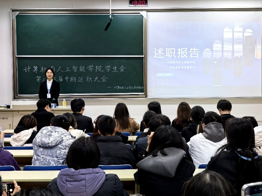 汇报结束后,各中心负责人依次上台进行述职答辩,他们回顾了本学期主办的活动,讲述了所取得的成果,同时仔细分析了其中存在的问题,对下学期的工作开展表现出殷切的期望。