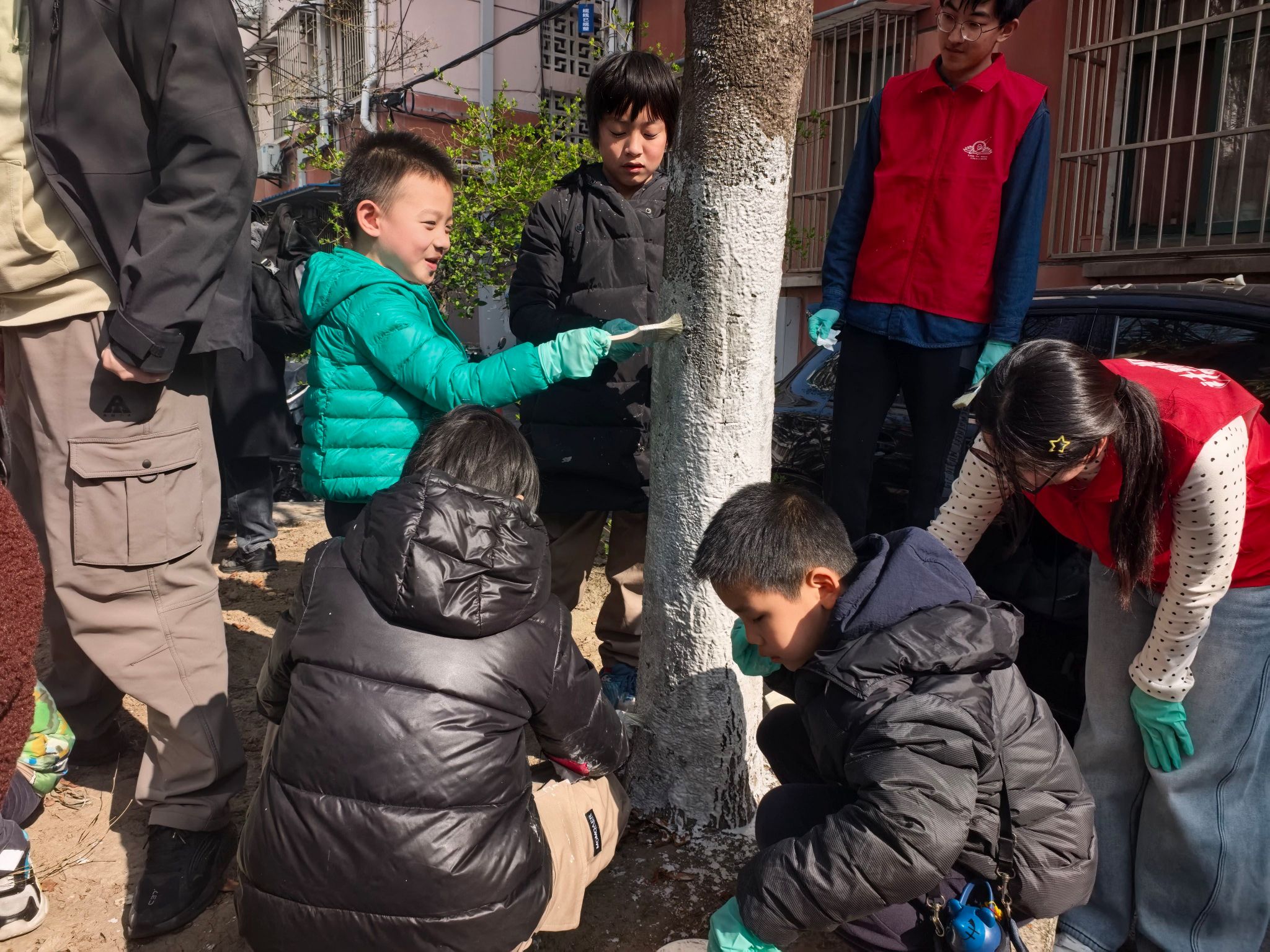 志愿者带领小朋友们为树干涂抹石灰水