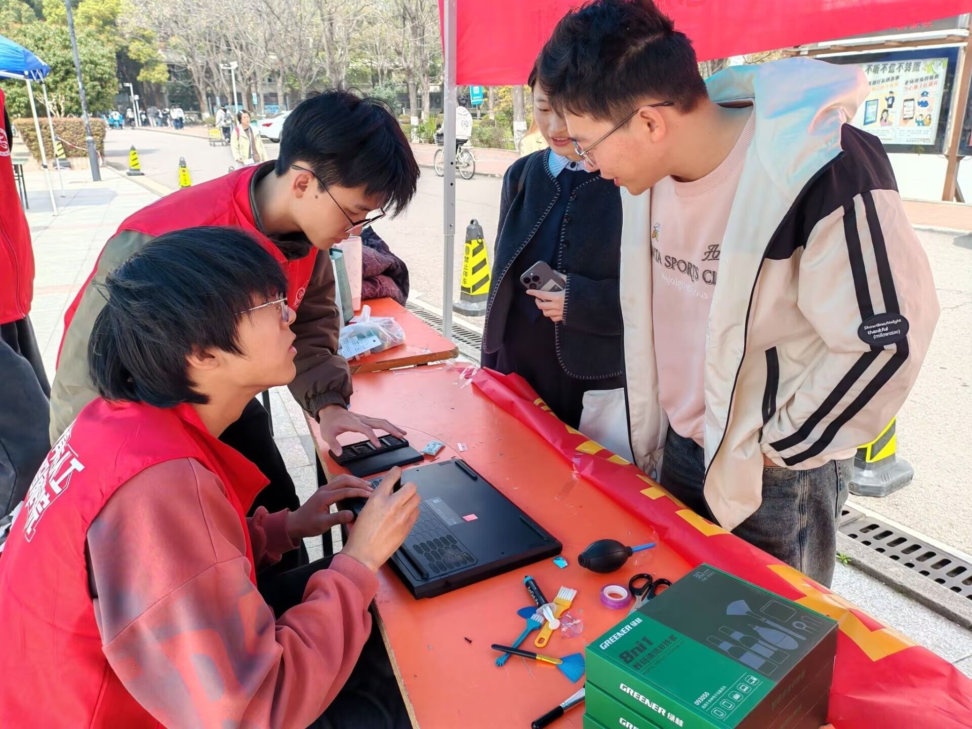 除了软件层面的 “内科诊疗”,志愿者们还为笔记本电脑(含游戏本)提供了细致入微的“外科养护”,用贴心服务传递雷锋式温暖。针对机身积灰、散热口堵塞引发的散热不佳、机身发烫等问题,志愿者们小心翼翼地拆解电脑后盖,手持专业毛刷与气吹为风扇、散热铜管进行深度清灰,细致疏通堵塞的散热通道,有效改善了设备散热效果;同时,他们还对电脑外观进行精细清洁,轻轻擦拭屏幕污渍、细致清理键盘缝隙积尘,让一台台老旧设备重焕整洁光彩,从硬件层面为设备稳定运行筑牢根基,用双手传递 “助人为乐” 的雷锋精神。
