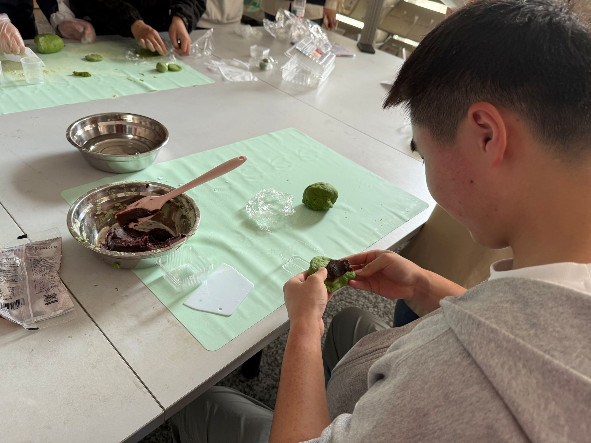 午餐后,德业楼内的清明主题实践活动成为核心亮点。青团制作区,桌上整齐摆放着青团预拌粉、温水、红豆沙馅、蛋黄肉松馅以及精致的包装盒。同学们将碧绿的青团粉倒入盆中,缓缓加入温水,一边搅拌一边揉搓。不一会儿,原本松散的粉末就变成了光滑柔软、富有弹性的面团。大家将面团分成均匀的小剂子,按压成圆片,舀入一勺自己喜爱的馅料——或是绵密的红豆沙,或是咸香的蛋黄肉松。轻轻收口、搓圆,一颗颗圆润饱满的青团便在掌心中诞生,散发着淡淡的糯米清香。同学们将亲手制作的青团小心装入盒子中,准备带回与朋友分享。来自江苏警官学院的一位同学笑着说:“以前都是买现成的,今天自己揉面、包馅,才知道青团这么做出来的,感觉清明更有味道了。”红桃视频