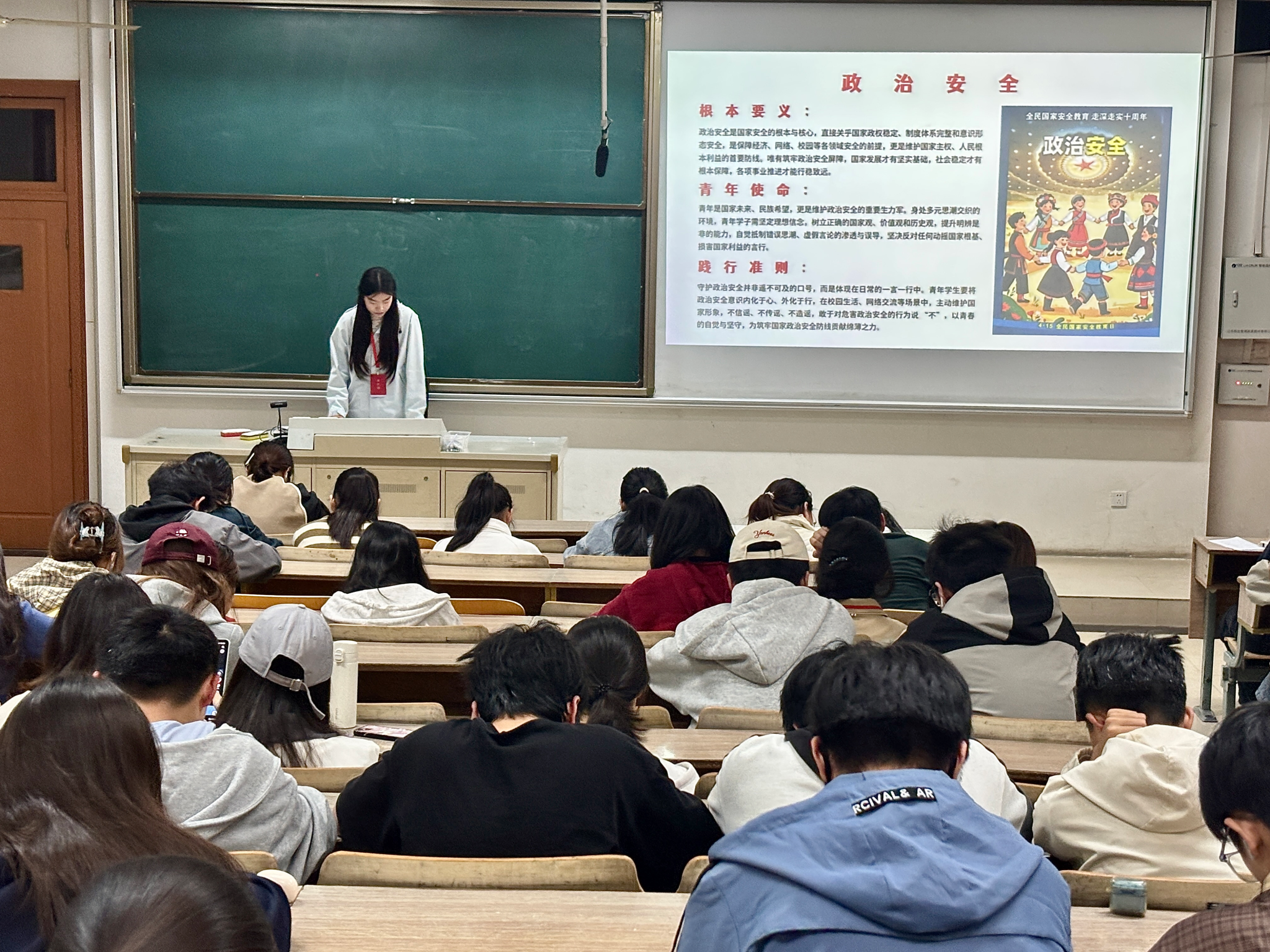 在专题讲解环节,主讲人聚焦“政治安全”这一国家安全的根本与核心,从根本要义、青年使命、践行准则三个维度展开深度阐释。明确政治安全直接关乎国家政权稳定、制度体系完整与意识形态安全,是经济、网络、校园等各领域安全的前提;强调青年作为维护国家安全的重要生力军,需坚定理想信念,树立正确的国家观、价值观和历史观,提升明辨是非的能力,自觉抵制错误思潮、造谣言论的渗透与误导;同时明确践行准则,要求同学们将维护国家安全内化于心、外化于行,在校园生活、网络交流等场景中主动维护国家形象,不信谣、不传谣,敢于对危害政治安全的行为说“不”,以青春的自觉与坚守,筑牢国家安全的青春防线。
