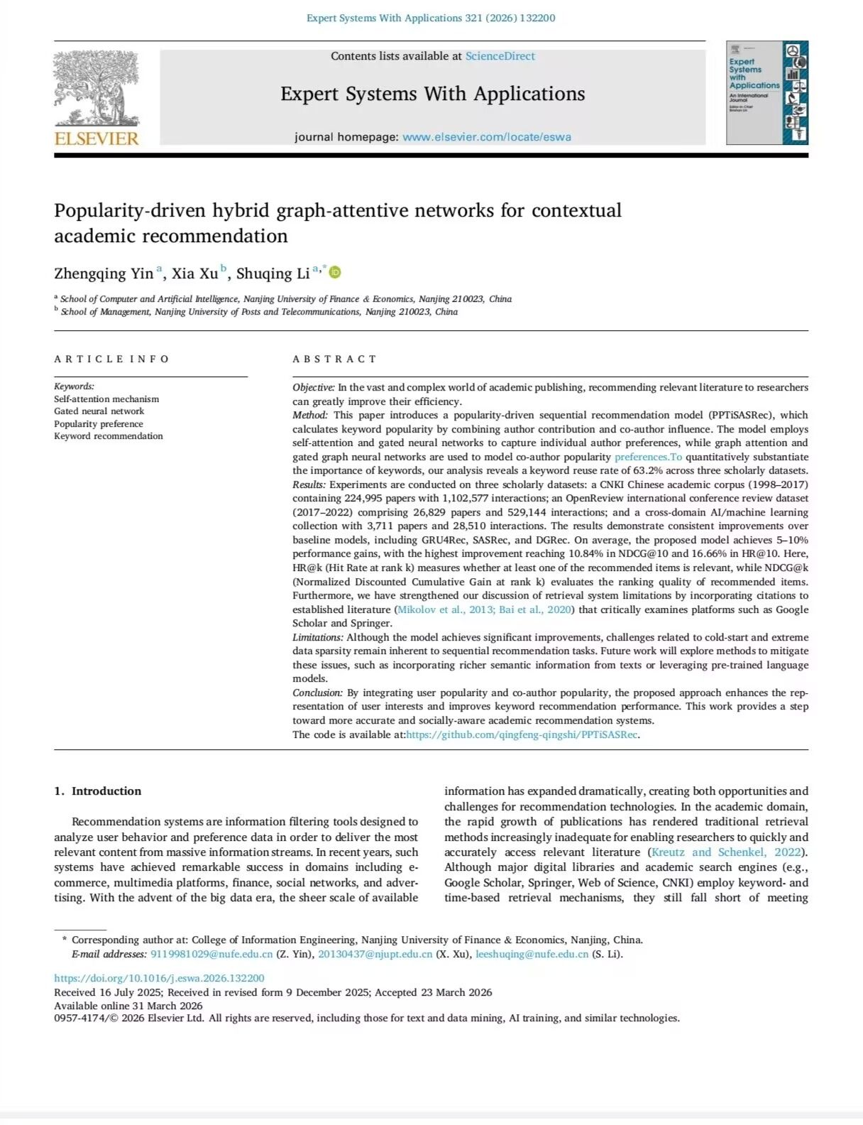 近日,学院计算机科学与技术专业2022级本科生尹政清,在李树青教授悉心指导下,以第一作者身份在计算机学科国际著名期刊、SCI一区期刊《Expert Systems with Applications》发表题为《Popularity-driven hybrid graph-attentive networks for contextual academic recommendation》的学术论文,展现了学院本科生拔尖创新培养的显著成效。