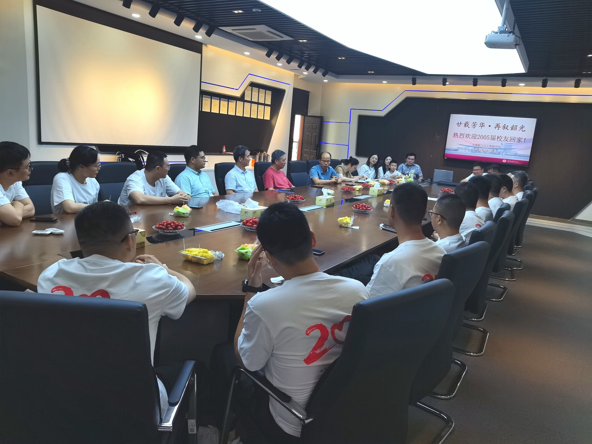在德业楼211会议室里,黄健院长首先代表学院对校友们在毕业20周年之际重返母校表示热烈欢迎,他向校友们介绍了学院20年来的发展情况。他表示,校友是学院最宝贵的财富,学院的发展离不开广大校友的关心与支持,希望校友们继续为母校的高质量发展建言献策、贡献力量。学院老领导祝庭辉、韩忠愿为校友们送上诚挚的祝福,希望校友们持续奋斗、心怀感恩,在工作中再创造辉煌。曾任计算机011班辅导员的龚月红老师、孙脉老师满怀深情地回忆起当年与校友们朝夕相处的点点滴滴,二十年后重逢的喜悦令他们倍感激动与欣慰,言语间满是对校友们未来的期许与祝福,真挚的话语引发了全场校友的强烈共鸣。随后,校友们再一次以自我介绍的方式认识了彼此,分享着各自二十年的人生旅程与近况。有不远千里从北京等地专程赶回的游子,也有在南京本土深耕多年、成为业界中坚的奋斗者。虽身处不同领域、相隔万里山河,但校友们的故事中那份对母校的感恩与眷恋却从未褪色。